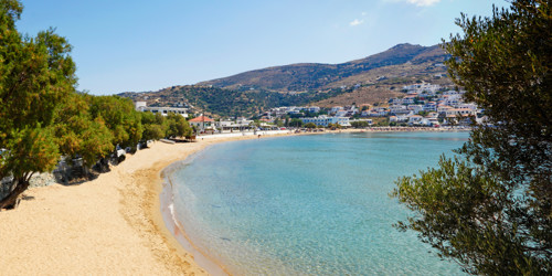 This is the busy golden sand beach on the west coast near the port of Gavrio. It has sunbeds and sunshades, a beach bar and water sports. The sand is said to be perfect for sand castles.