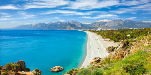 One of the main attractions in Antalya on the Mediterranean coast is Konyaalti Beach, which spans for 7 kilometres. Konyaalti Beach is great to swim in and with shaded trees, tables, booths, cafés, and restaurants, all the facilities you need are available. The Taurus mountains in the background, as well as the cliffs on each end, create a stunning setting for a day of swimming and sunbathing.