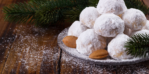 The flavours of orange, cinnamon and cloves are also put to sweeter use in melomakarona, egg-shaped biscuits coated in honey and walnut pieces, while the buttery kourambiethes cookies are rolled in powdered sugar and look like snowballs.