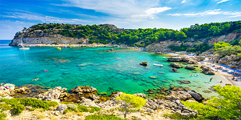 Faliraki is another resort that’s ideal for both active days and sunbathing. Some 16km south of Rhodes Town, water skiing and windsurfing are among the things on offer at Faliraki Beach. The 4km golden sandy beach is well-equipped with sunbeds and parasols and there is a good selection of bars and restaurants, as well as a waterpark. A more secluded option nearby is Kathara Bay, which features a picturesque harbour for fishing boats.