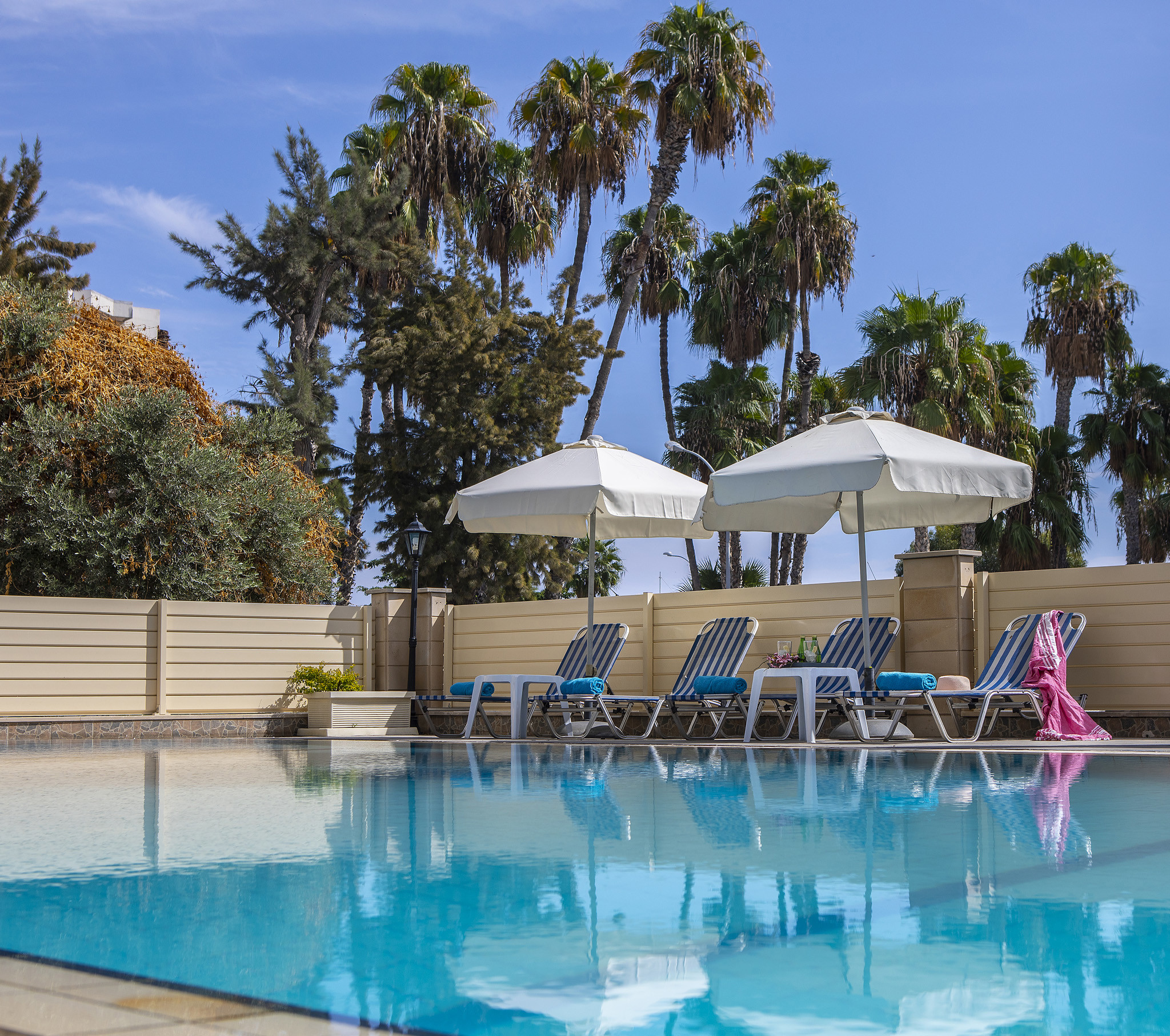 The hotel has 94 fully air-conditioned guest rooms, offering quality and comfort, with private balconies most of them offering side sea view. The rooms are recently renovated with high quality laminate floor, new furniture and new TVs. Hotel facilities include lobby, bar, restaurant, pool bar, two swimming pools (one indoor), and health club with sauna, jacuzzi and gym.