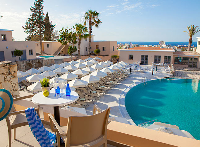 The Louis St. Elias Resort & Waterpark is situated on a green hillside overlooking Protaras bay. It is only a 15 minute walk to the beach and only 5 minutes walk to the centre of Protaras. The resort rests on a total of 40.400 sq. metres of beautiful gardens. The spacious studios and suites, with their unique architecture and amazing views give a feeling of independence and relaxation. The resort’s facilities include a reception building with a bar and sitting areas, a main restaurant with extensive verandas, a brand new tavern, a swimming pool with a second bar and terrace, two kids clubs and playground, tennis court, a second pool with water slides, a kids pool with water games as well as a spa.