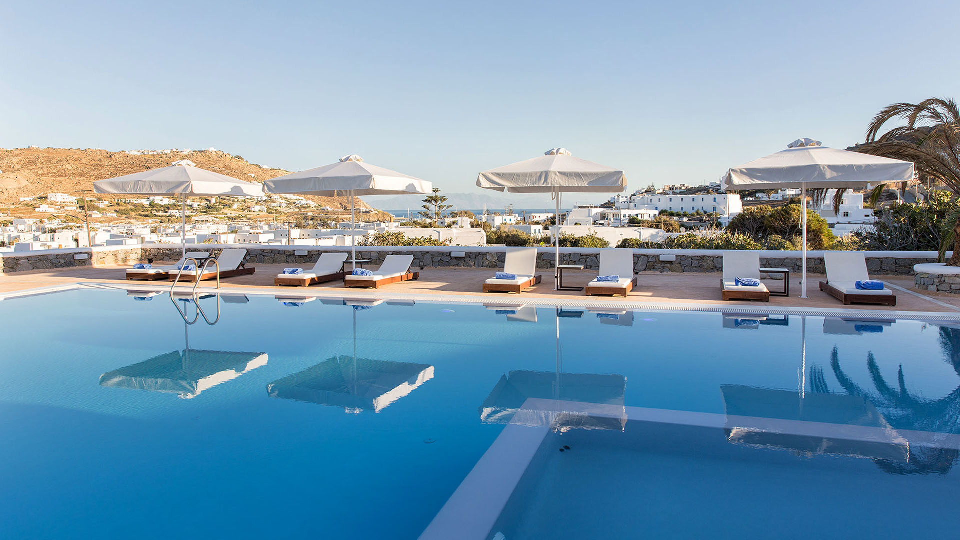 The suites all have beautiful, sea elements, with one-of-a-kind light fixtures resembling limpets and amoebas. Also, a lovely room divider that separates the living rooms, brings its very own sea breeze into the space of the suites. So, take off your winter skin and grab your pool towel that you can get from the pool bar. Each suite has a view of either the bay of Ornos or the Verdant Gardens.