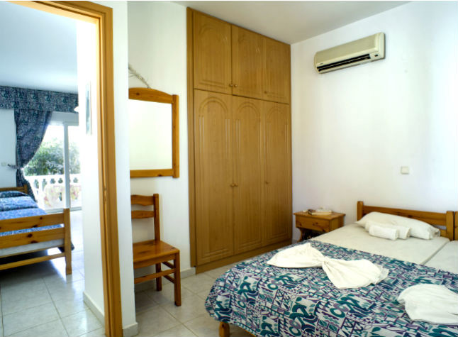 One bedroom apartments sleeps up to 3 persons featuring a separate bedroom with a double or twin bed, living room with sofa bed, bathroom with shower, free Wi-Fi, air conditioning (payable locally), kitchenette with fridge, hob and cooking utensils and a balcony overlooking Ferklos Castle and the hills of Rhodes.