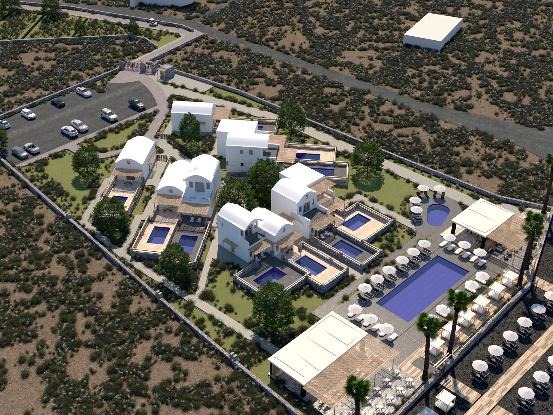 The resort provides guests with absolute privacy in a secluded location of Santorini, on the coast of a traditional village, Exomitis. The resort is also close to Akrotiri which is one of the most important Cycladic settlements since antiquity dating back to 4000 BC and also the picturesque seaside village of Perissa with its famous black sand volcanic beach.