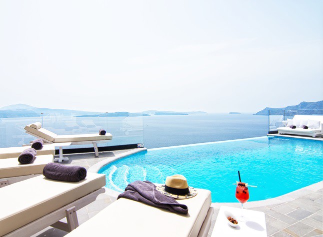 Infinity Suite with Private Outdoor Heated Pool (45 m2) sleep up to 2 persons Spacious bedroom with Queen size bed, sitting area with an amazing sea view, airy bathroom with glass cabin shower – jet. An open air private terrace of 40m2 featuring an Infinity Outdoor Swimming Pool, dining area and sun beds.