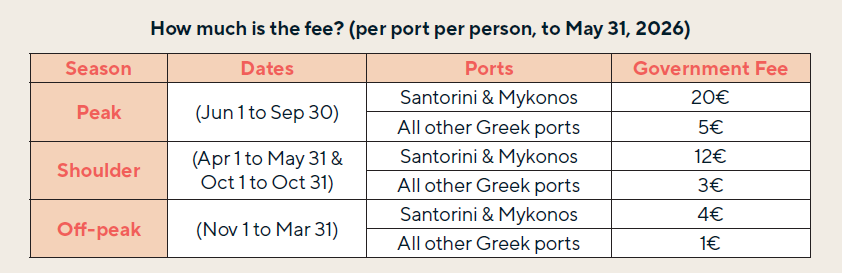 It’s a new fee that applies to all cruise guests visiting the Greek Islands. It’s part of an initiative by the Greek Government to promote sustainable tourism – helping to support island infrastructure and make sure local communities benefit from the growing number of visitors.